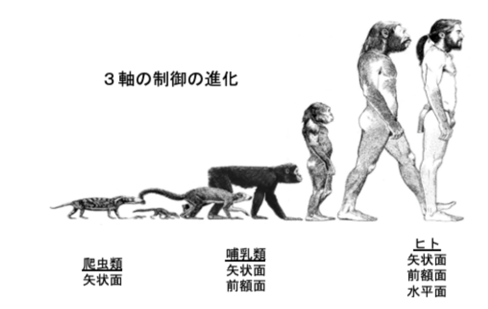 前回までの投稿でも述べましたが、地球上の生物には一定の重力が平等にかかっており、常に3軸(矢状面、前額面、水平面)を制御しながらその時々の環境に適した動作(意とするパフォーマンス)を選択しています。生き物の進化をよく見ていくと、単に形態が変わっていくだけではなく、動作(制御可能な軸)も変化していくのがわかります。