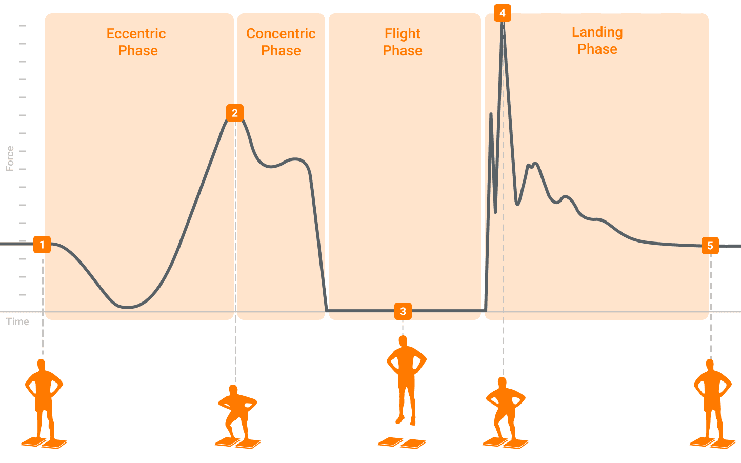 上の図は、フィジカル測定において最も需要の高いCMJ (カウンタームーブメントジャンプ)というテストを用いた波形です。結果は以下4つのフェーズに分けられます。