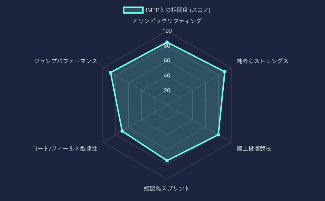 下記レポートが示すように、IMTPデータは、オリンピックリフティングや短距離スプリント、ジャンプといった多岐にわたるパフォーマンスと強い相関関係を持ちます。これは、IMTPが身体の基本的な筋力と爆発力を包括的に評価できる汎用性の高いツールであることを意味します。