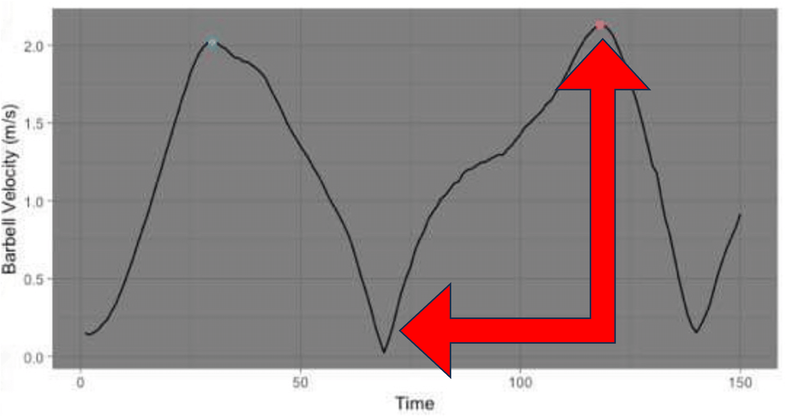 ベロシティ(速度)シーケンスは、アルファベットの「V」の字に似たグラフを描きます。左半分が沈み込む際のエキセントリック速度、右半分が挙上する際のコンセントリック速度です。理想的な動きでは、右半分のコンセントリック局面の線が、左半分よりも急な角度で鋭く立ち上がります。これは、減速から加速への切り返しが極めてスムーズかつ爆発的に行われている証拠です。