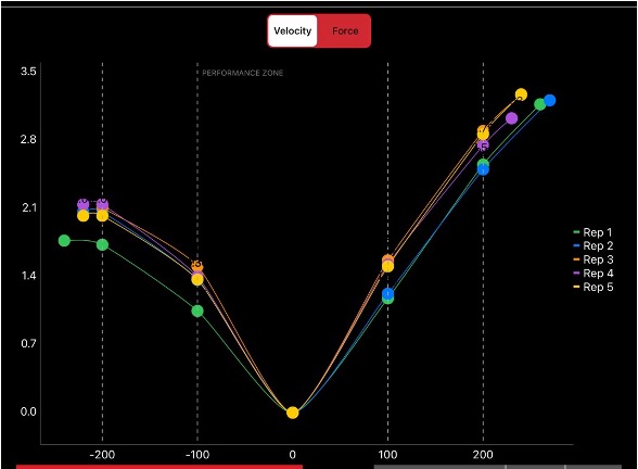 ベロシティ(速度)シーケンスは、アルファベットの「V」の字に似たグラフを描きます。左半分が沈み込む際のエキセントリック速度、右半分が挙上する際のコンセントリック速度です。理想的な動きでは、右半分のコンセントリック局面の線が、左半分よりも急な角度で鋭く立ち上がります。これは、減速から加速への切り返しが極めてスムーズかつ爆発的に行われている証拠です。